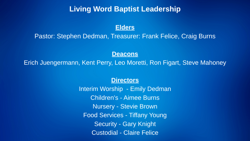 LEADERSHIP Stephen DedmanSenior Pastor pastor@livingwordbaptist.net Daily Devotions Craig BurnsElder Frank Felice treasurer@livingwordbaptist.net